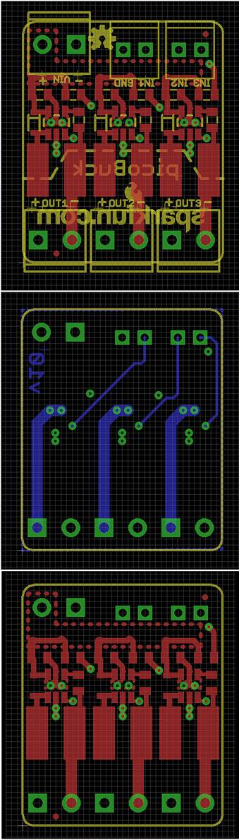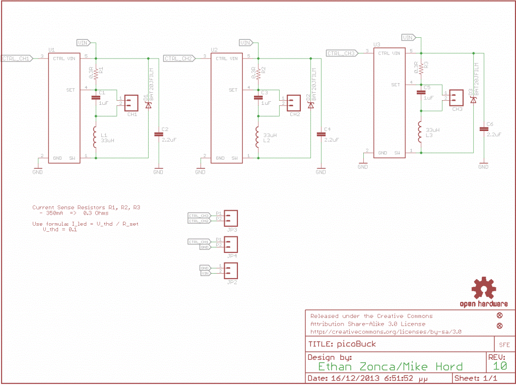 Маленький и недорогой 3-канальный драйвер светодиодов. Он использует постоянный ток, который приближается к эффективности 95% (теоретически). Основан на AL8805 LED Lighting Buck Driver от Diodes Inc. Поддерживает широкий диапазон входных напряжений (от 6 до 20 В), которые могут быть подключены к VIN. Имеет три входа для каждого канала драйвера, обозначенные IN1, IN2 и IN3, которые могут управляться с помощью стандартной логики 3.3v или 5v. Светодиоды подключаются к выходам драйвера OUT1 - OUT3. Каждый канал светодиода RGB должен быть подключен к драйверу отдельно: этот драйвер, как и большинство драйверов buck, не поддерживает светодиоды с Common-anode или common-cathode RGB. Каждый канал может управлять светодиодом при 350 мА. Ток возбуждения устанавливается небольшим токочувствительным резистором на плате. Если вам нужно управлять светодиодами при более высоких или меньших токах, просто замените токовый резистор, чтобы достичь желаемого тока. Вы можете рассчитать значение вашего текущего чувствительного резистора в электронной таблице AL8805.Чтобы использовать режим цифрового запуска, подайте стандартный сигнал 3.3В или 5В ШИМ на любой из трех входов. Этот метод дает хорошее разрешение по яркости во всем диапазоне при использовании 8-10 бит PWM. Чтобы использовать аналоговый режим, подайте аналоговое напряжение между 0 В и 2.5 В на любой из трех входов. Это аналоговое напряжение управляет величиной тока, который подается светодиод, до тока, установленного токоограничивающим резистором.Обратите внимание, что аналоговый метод не действует для последних 20% тока - в этот момент ток падает до нуля.