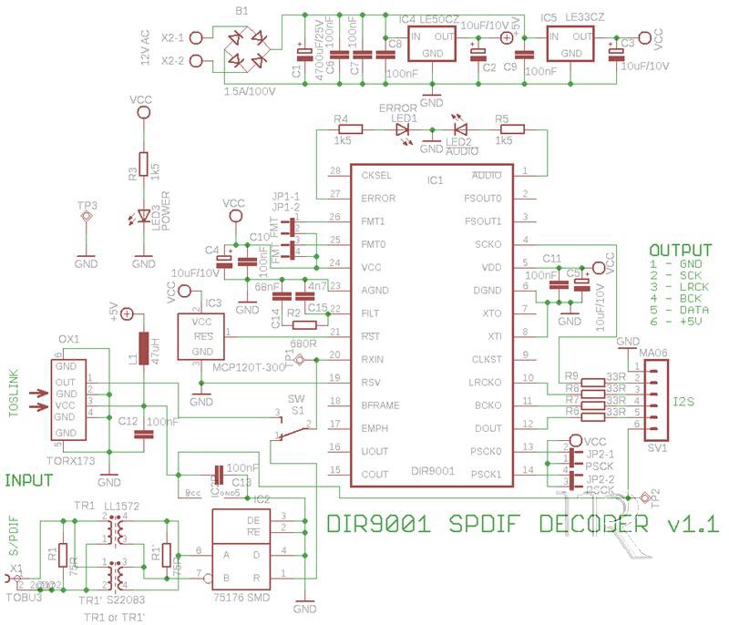 В секции мостового выпрямителя и сглаживающего конденсатора надо использовать LOW-DROP стабилизаторы напряжения IC4 LE50CZ и IC5 LE33CZ. На оптическом входе используется оптический приемник Ox1 Toshiba TORX173 с выходом TTL. На электрическом входе из-за гальванической развязки используется импульсный трансформатор TR1 и после него RS485 приемопередатчик IC2 75176 с выходом TTL. Лучшая форма сигнала получается с нагрузочного резистора 75R, подключенного до трансформатора. Для конструкции можно использовать трансформатор LL1572, S22083 или аналогичные. Схема на DIR9001 требуется внешний контур сброса. Я использовал имеющуюся MCP120T-300. Схема DIR9001 можете использовать часы из хрусталя или из входного сигнала. Схема содержит внутренний PLL без внешней задержки, принимает входной сигнал с частотой дискретизации 32, 44,1, 48, 88,2 и 96 кГц. Внутренний PLL требуется внешний фильтр, состоящий из R2, С14 и С15. Выходные сигналы GND, SCK, LRCK, ВСК, DATA и + 5V идет на шести контактный разъем, который предназначен для подключения ЦАП. POWER LED загорается, когда напряжение питания присутствует. Индикатор ОШИБКА загорается когда S/PDIF сигнал отсутствует или обнаружена ошибка. Светодиоды AUDIO загораются, когда получим сигнал S/PDIF не содержащий RAW PCM аудио данные. Например, если принимаются закодированные AC3 или DTS сигналы.