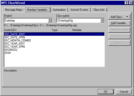В окне списка Control IDs: данной вкладки перечислены все идентификаторы ресурсов, используемыев созданном нами диалоговом окне. Теперь необходимо сопоставить этим идентификаторам ресурсов идентификаторы переменных в классе, обрабатывающем сообщения данного диалогового окна.